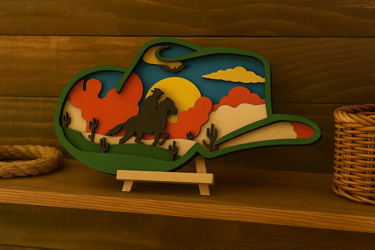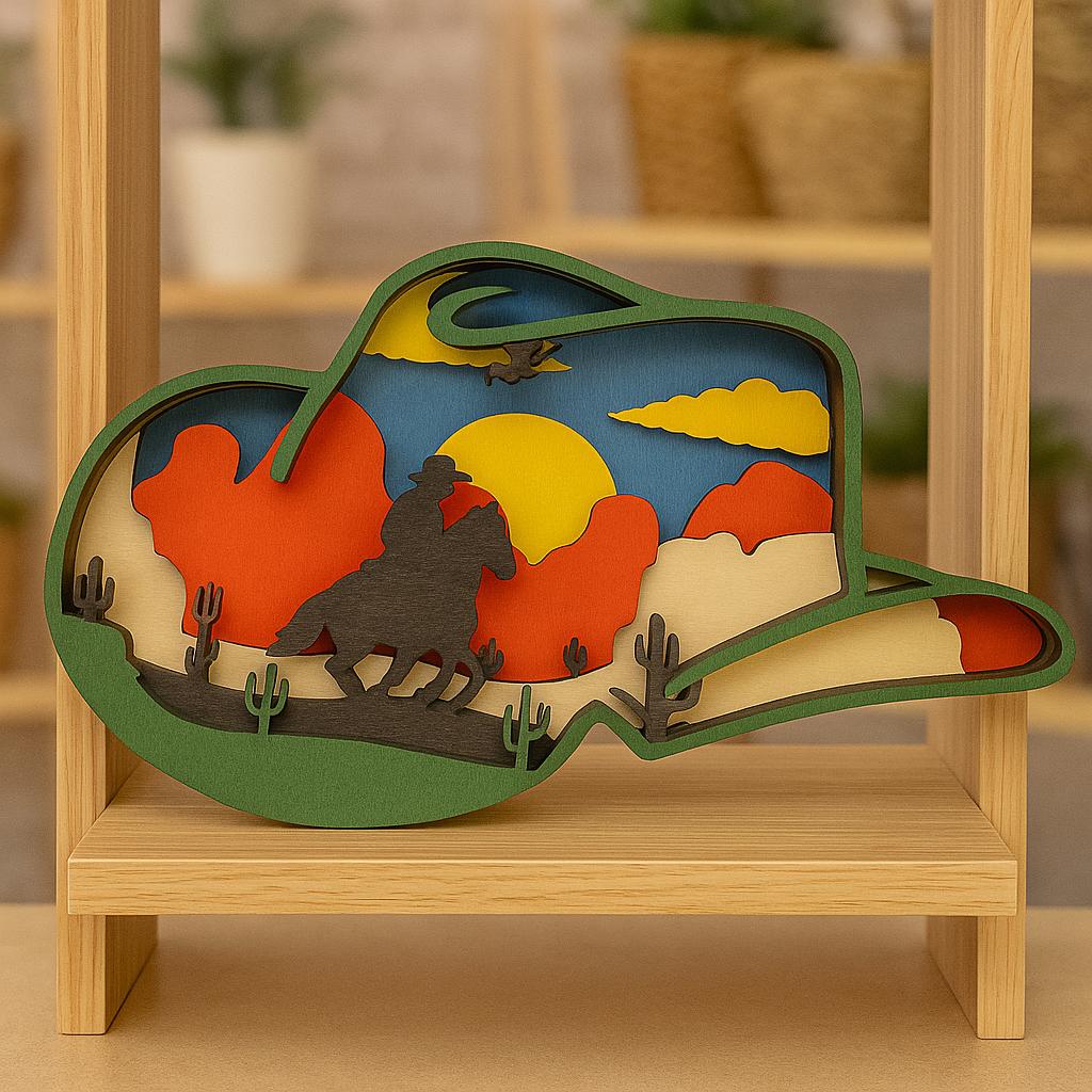 Bring the Wild West into your home with this 4x6 inch multi-layered cowboy sunset art. Featuring a cowboy on horseback, desert cacti, and a vivid sunset, this handcrafted design adds rustic western charm to any space. Perfect for western décor lovers, unique gifts, or display pieces.